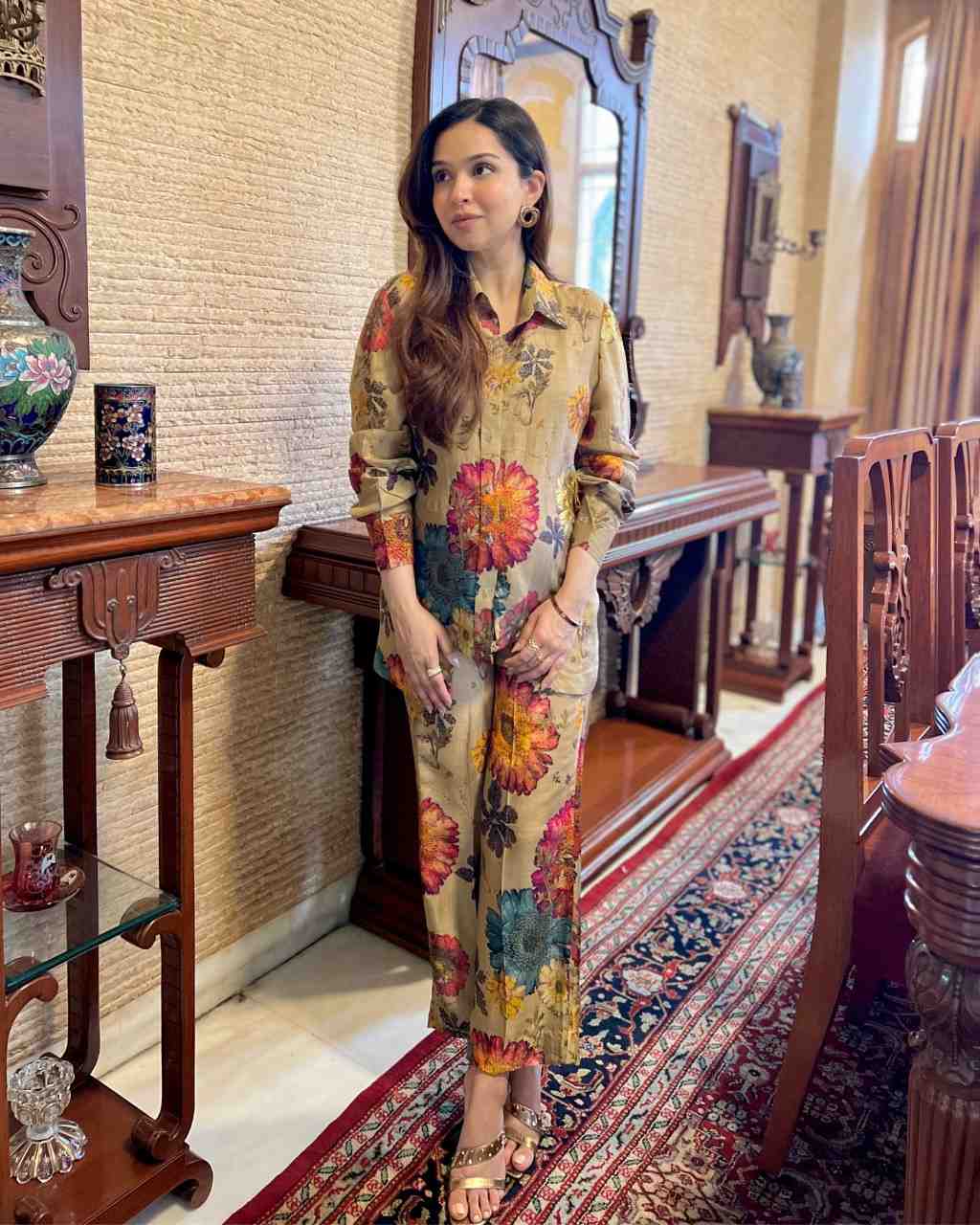 Silk co-ord set on mushroom beige base, adorned with delicate floral prints. Lightweight, breezy, and perfect for effortless day-to-evening style.