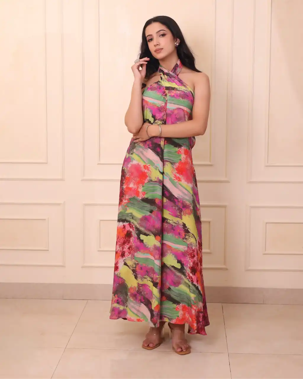This vibrant multi-color maxi dress is crafted from comfortable crepe material, draping elegantly for a stunning look. Featuring a unique twisted drape neckline, it adds a touch of sophistication and flair. Perfect for casual or semi-formal occasions, this long dress exudes effortless style and charm.