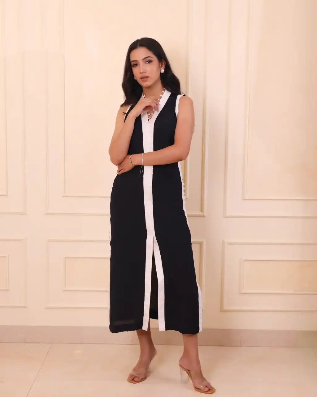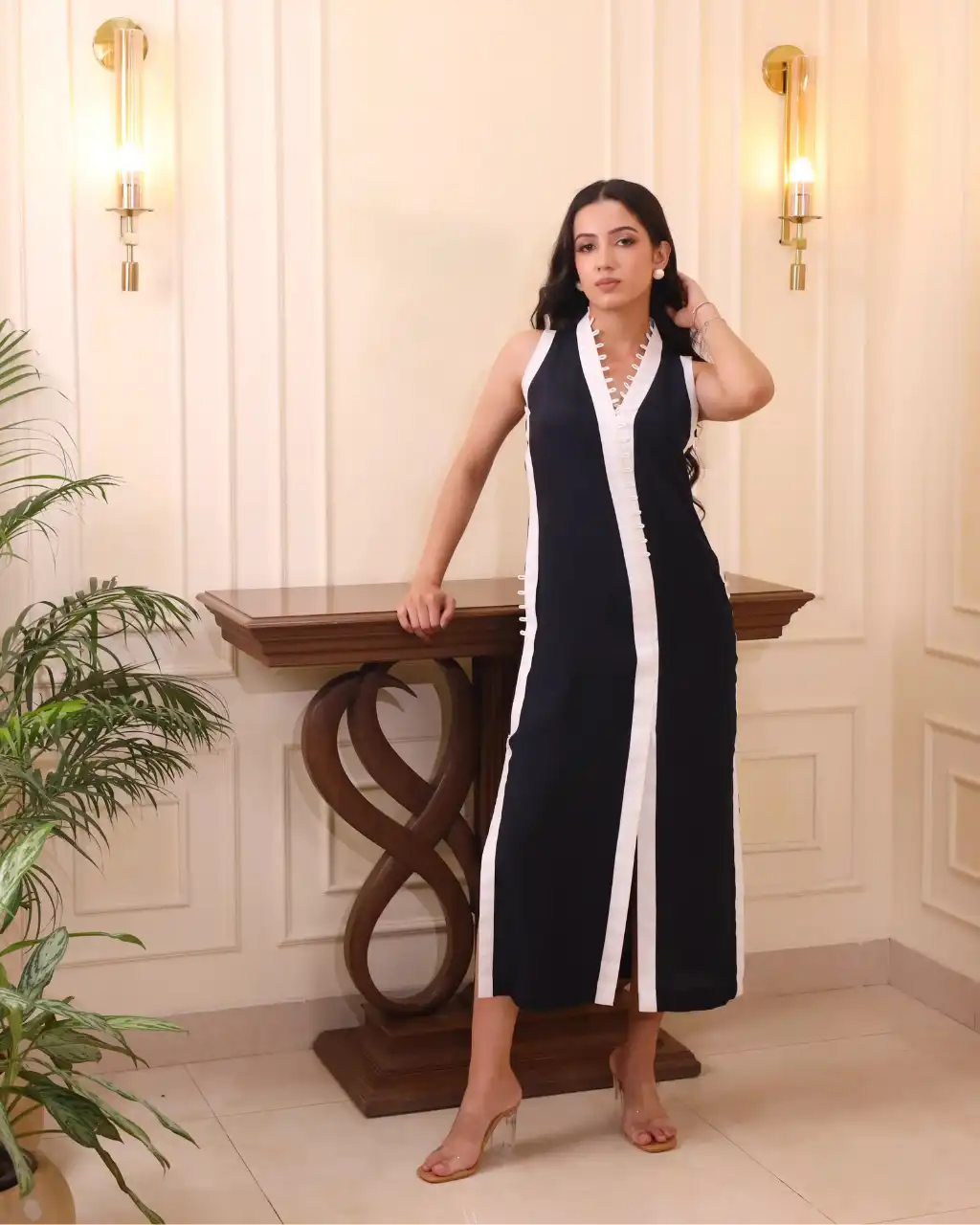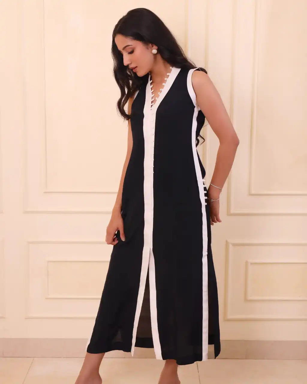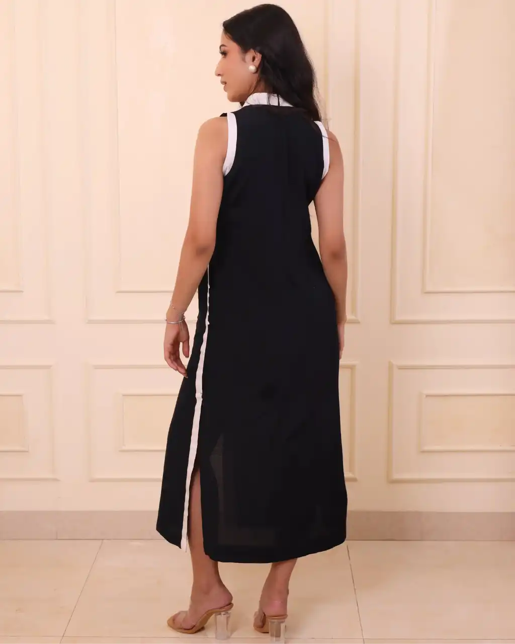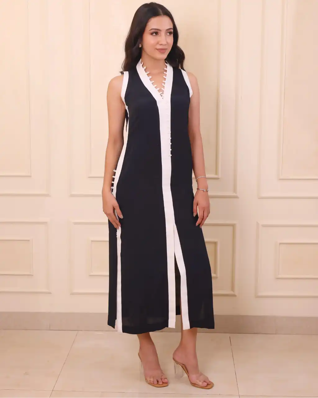 This chic black and white crepe dress features a stylish design with loops on the neckline, adding a modern touch. The side slits enhance the dress's elegance and movement. Crafted from comfortable crepe material, it's perfect for making a statement at casual or semi-formal events with its striking color combination.