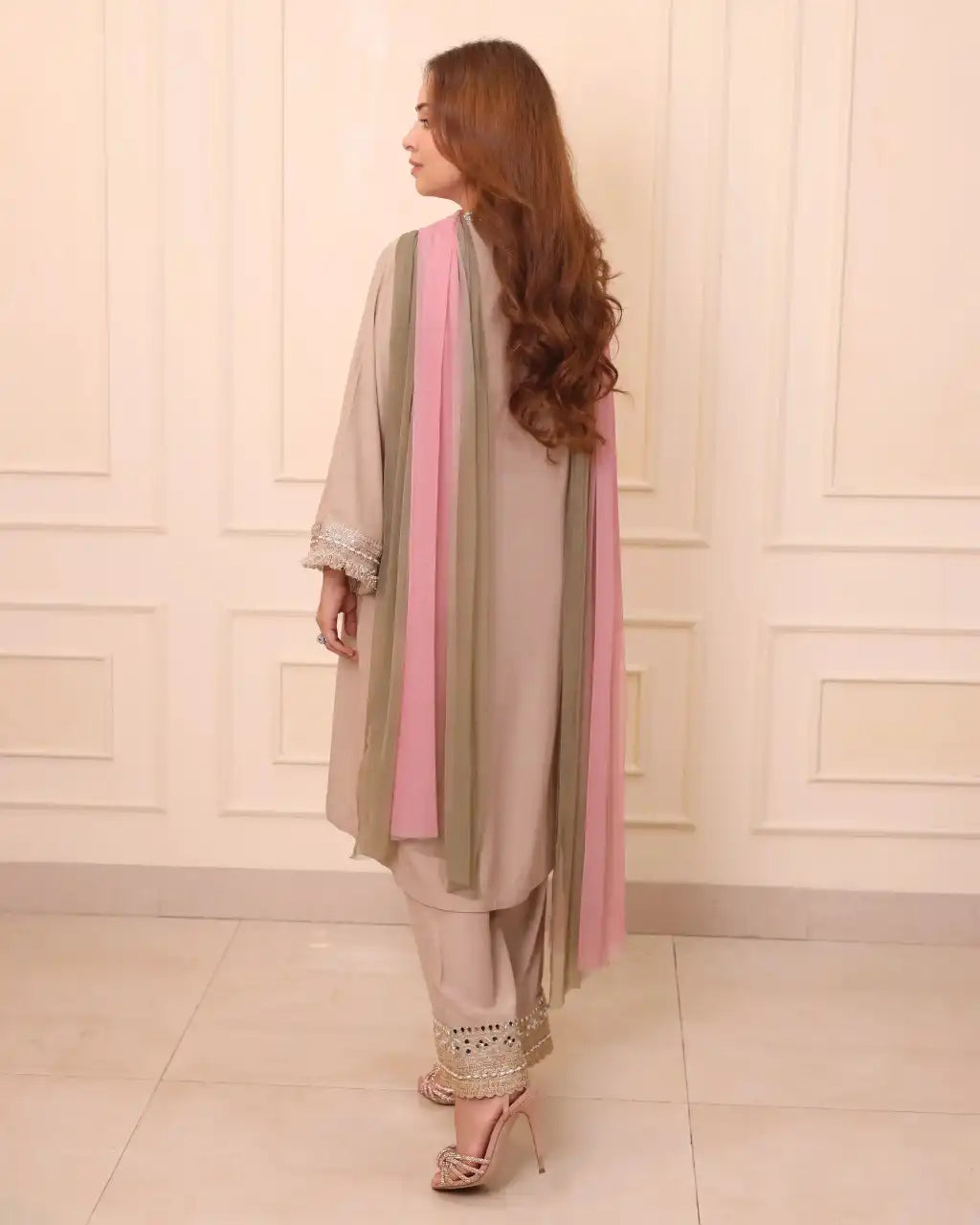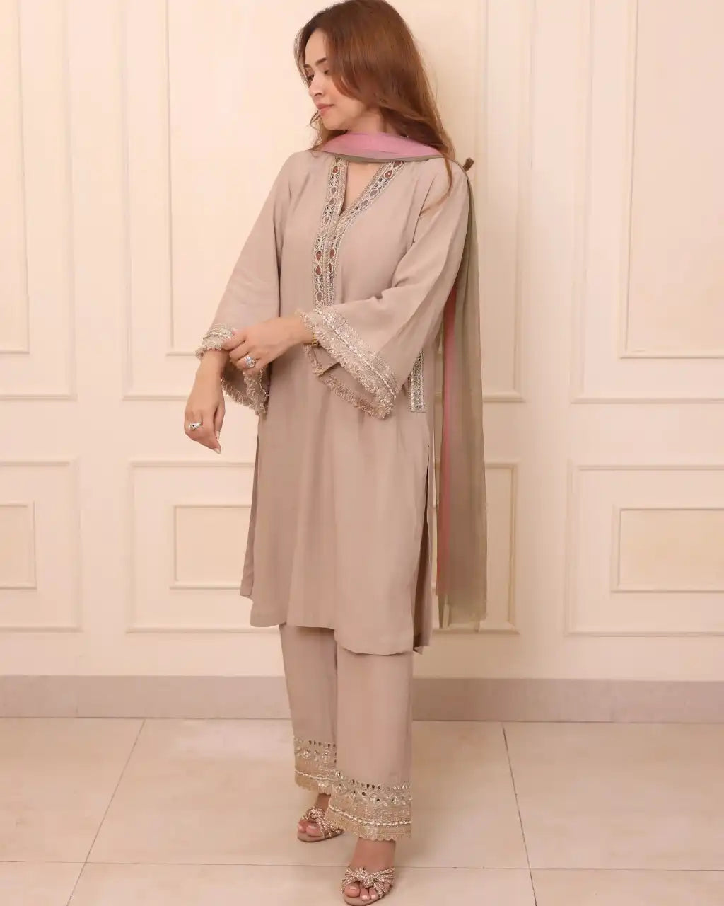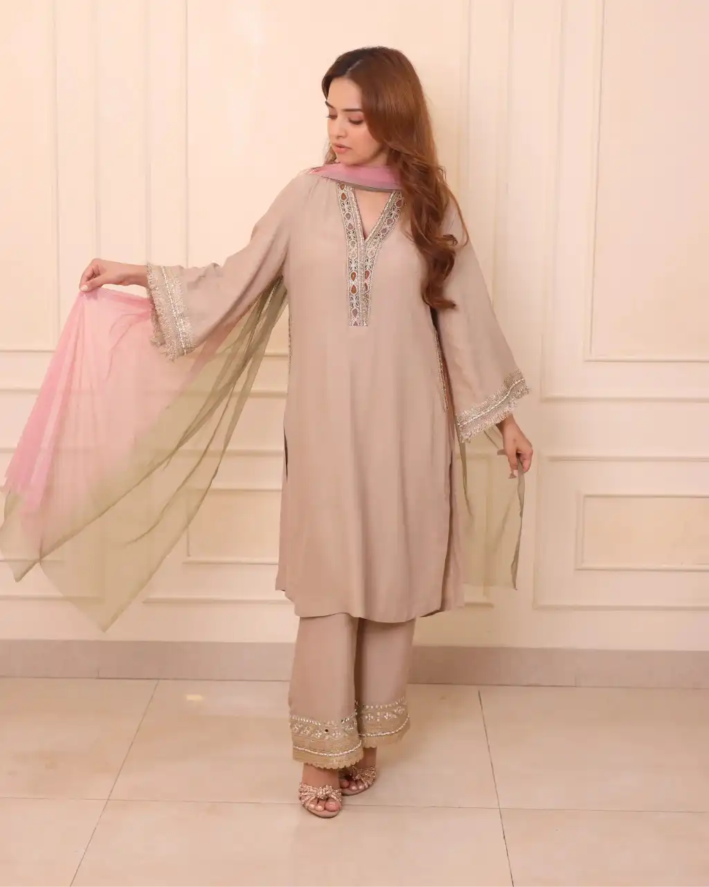 This elegant semi-crepe kurta in a soft mushroom hue features intricate resham thread work on the neckline, adding subtle charm. The sleeves and pant are adorned with delicate zari thread borders, enhancing its sophistication. Paired with a stunning net ombre dupatta, this ensemble exudes grace and refinement, perfect for special occasions or festive events.