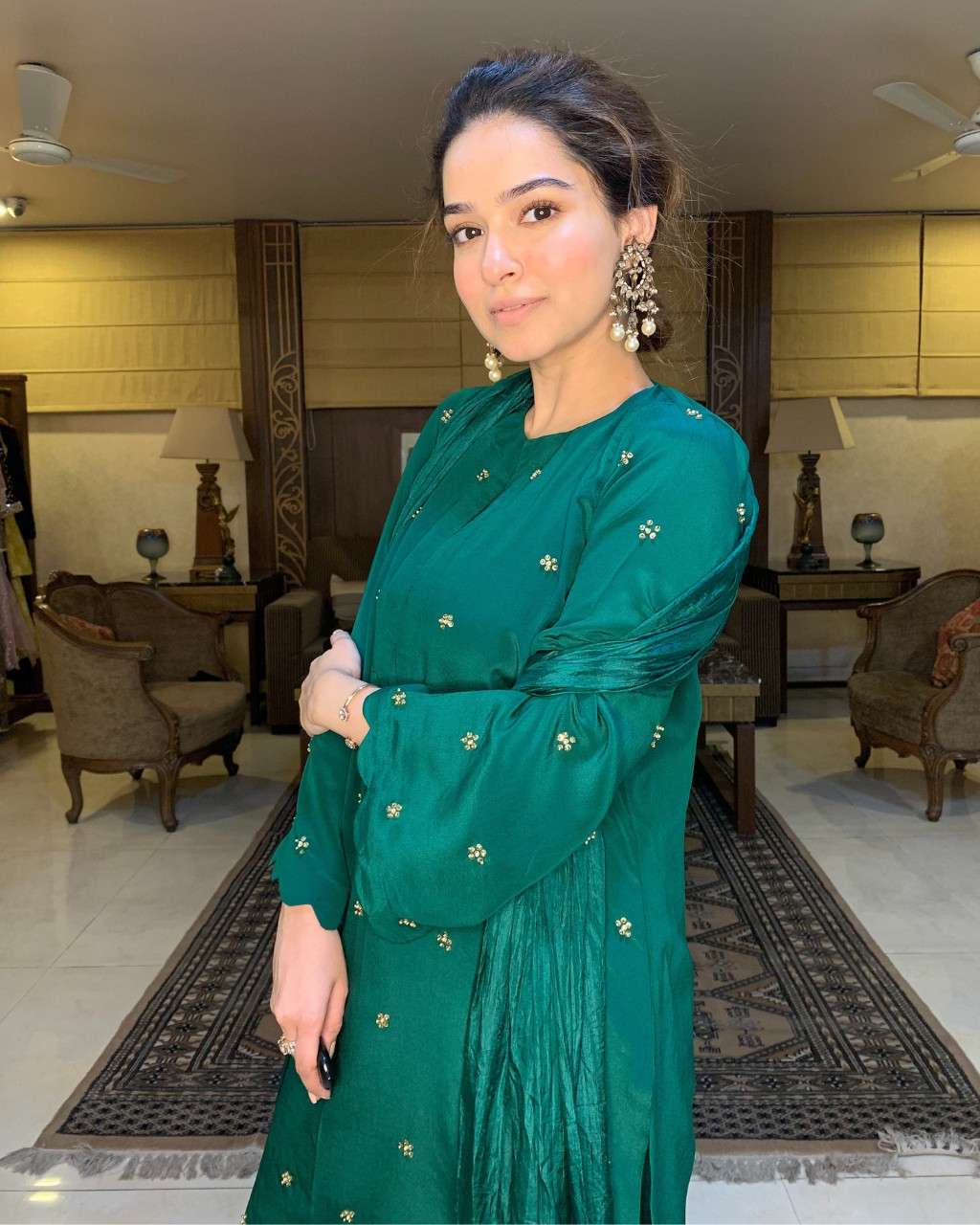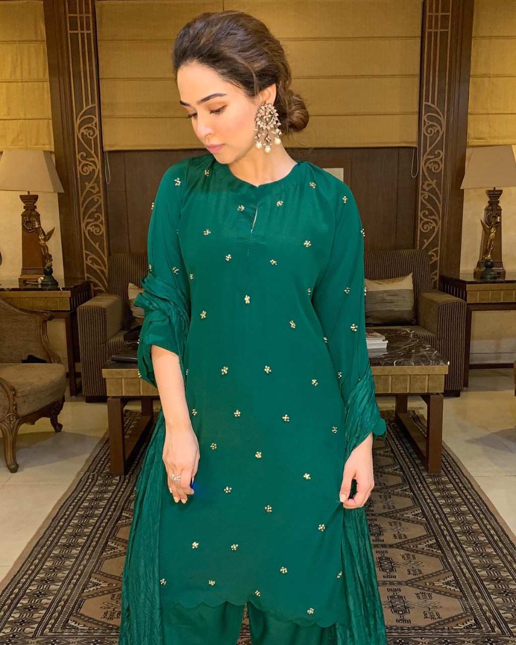 Pure crepe kurta set in rich green, adorned with hand-done sequins and pearl work. Paired with a soft silk dupatta for a graceful finish.