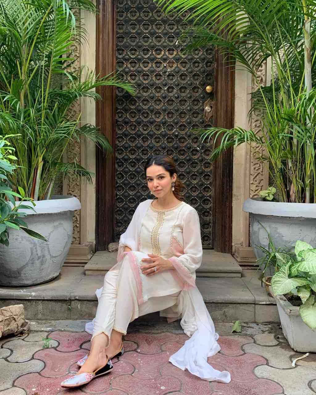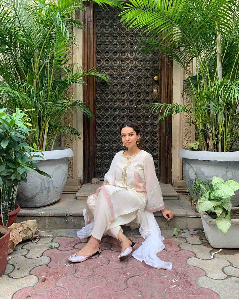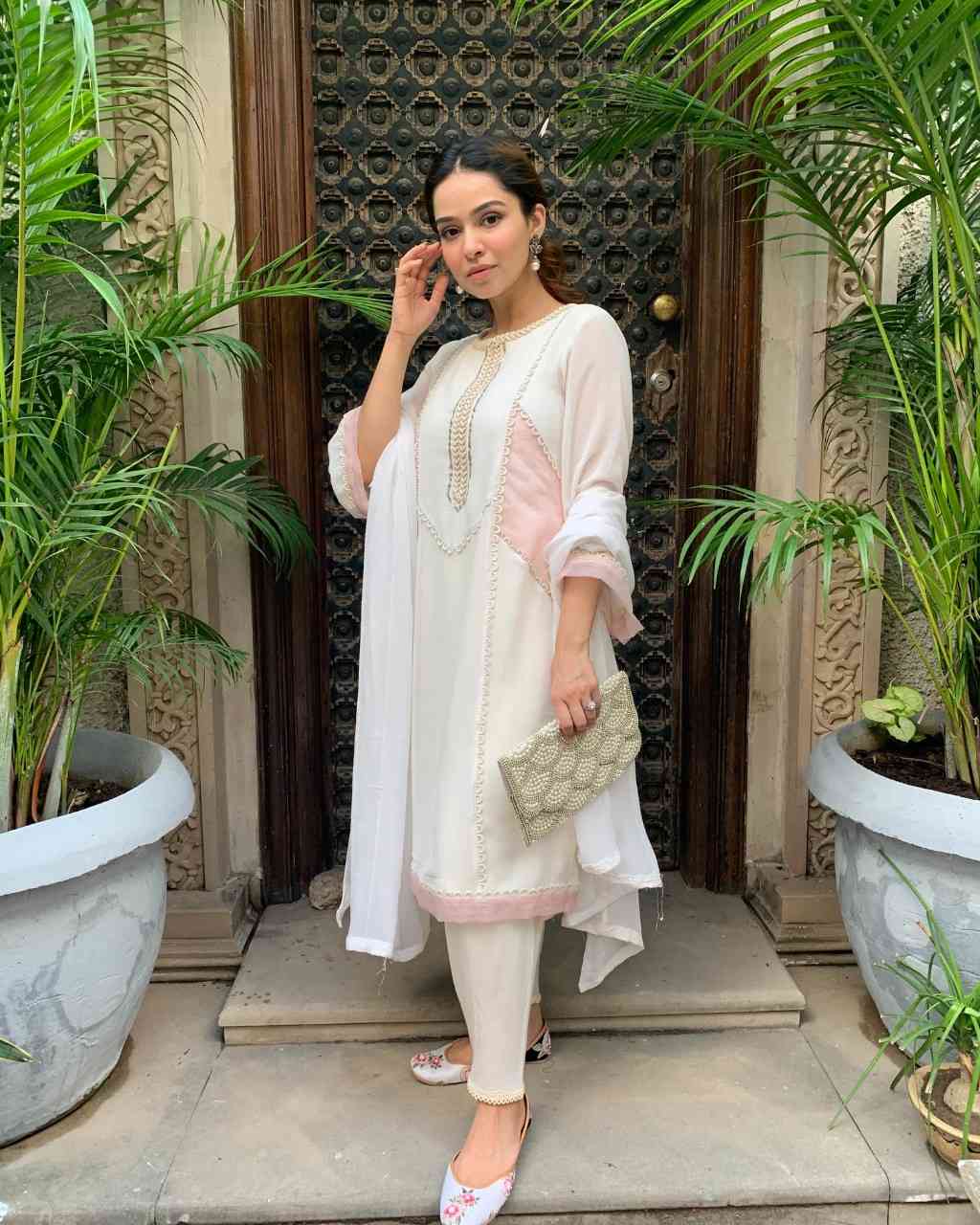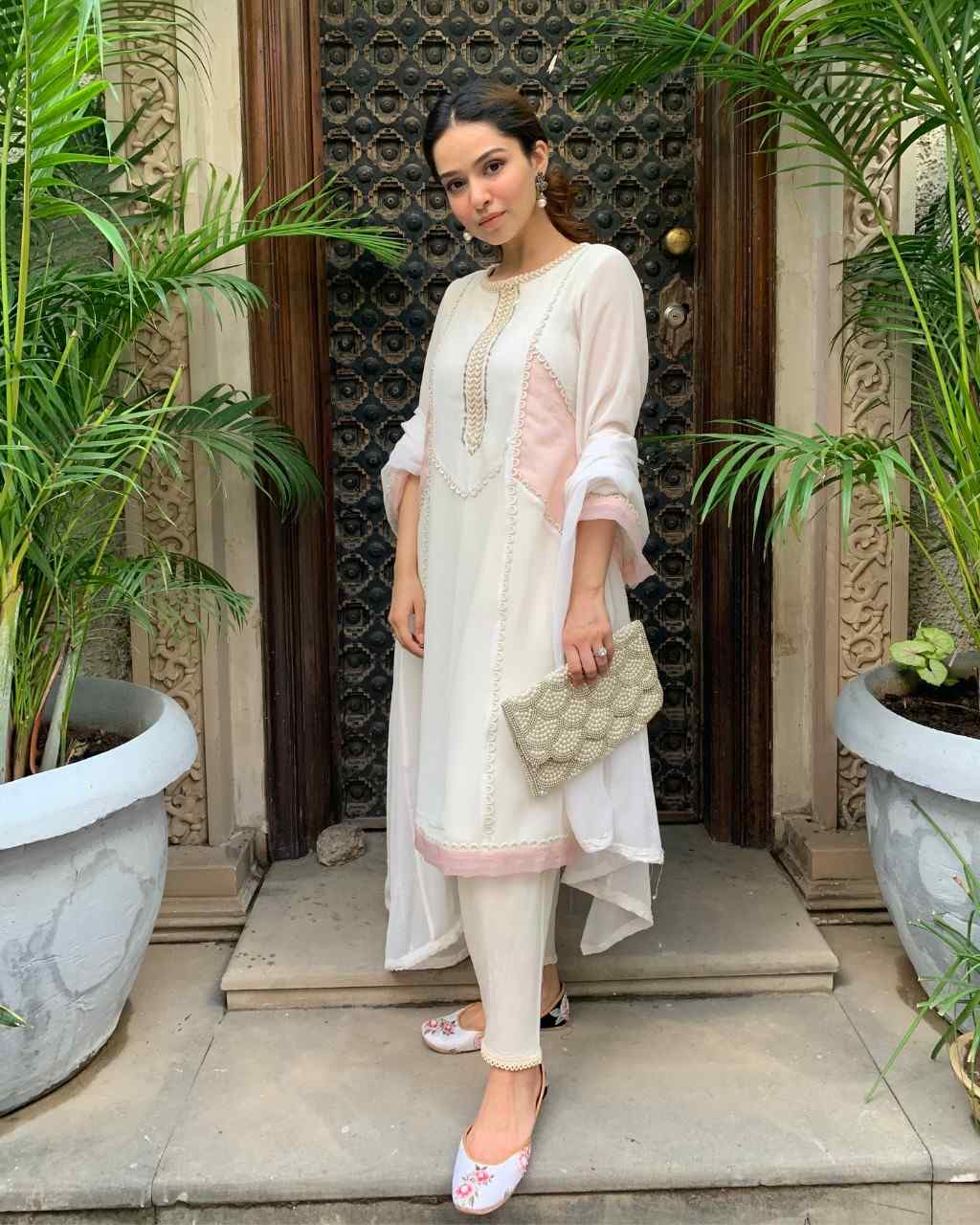Platinum georgette 3-panel kurta adorned with scallop lace detailing and katdana work on the neckline. Accented with delicate pink fabric patches on the sides. Paired with a tapered cotton salwar and a soft georgette dupatta for a refined, contemporary look.