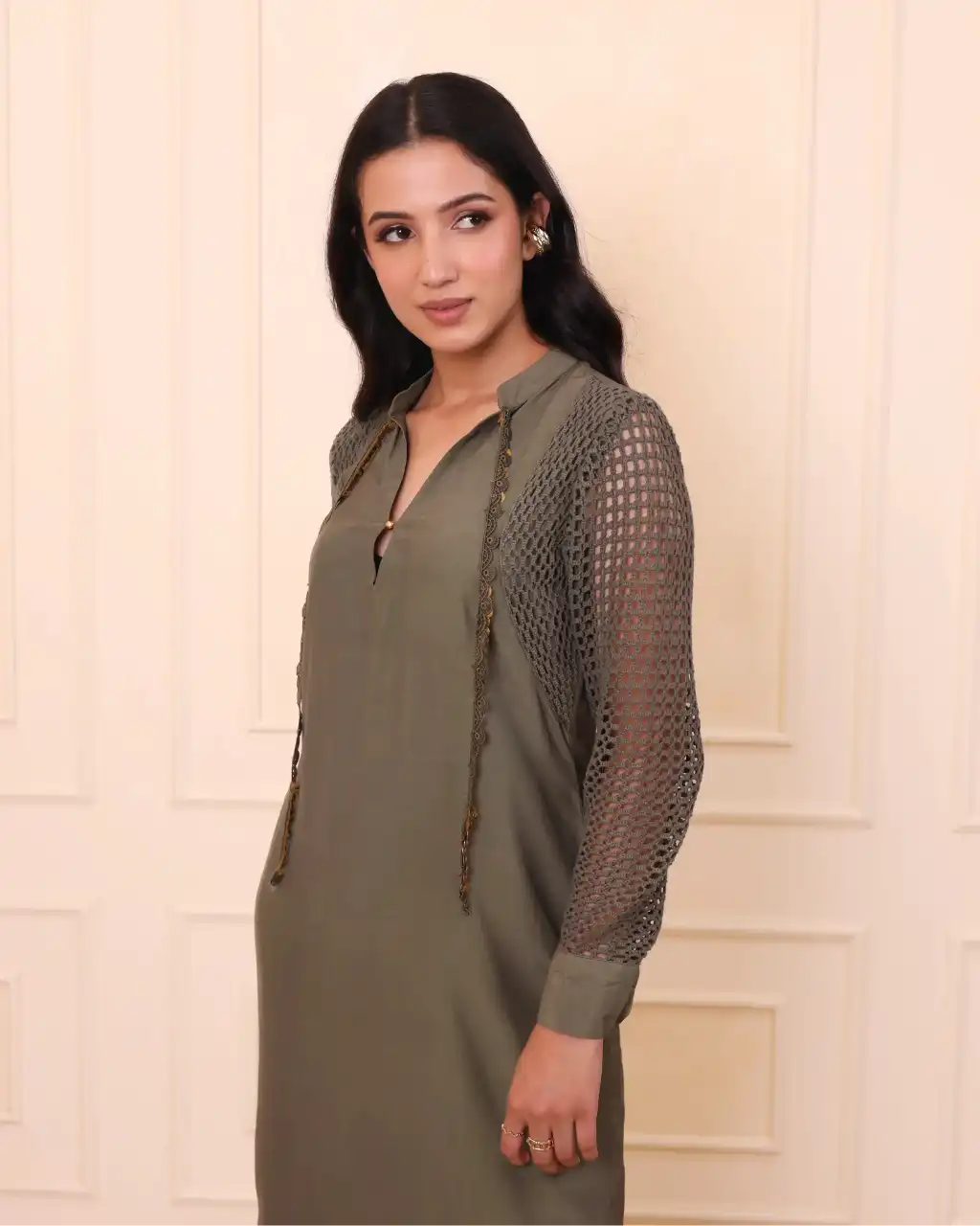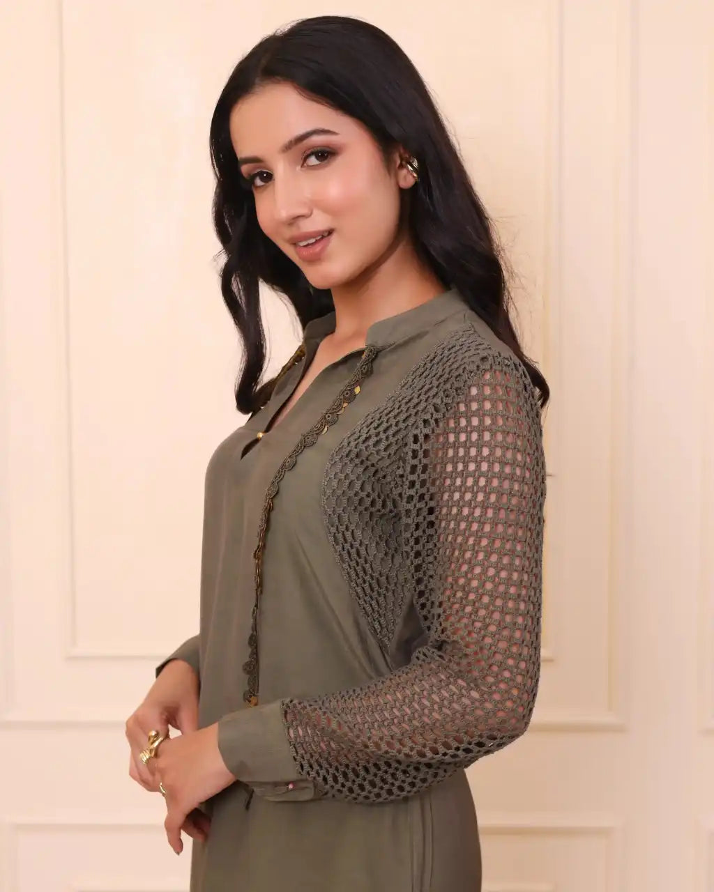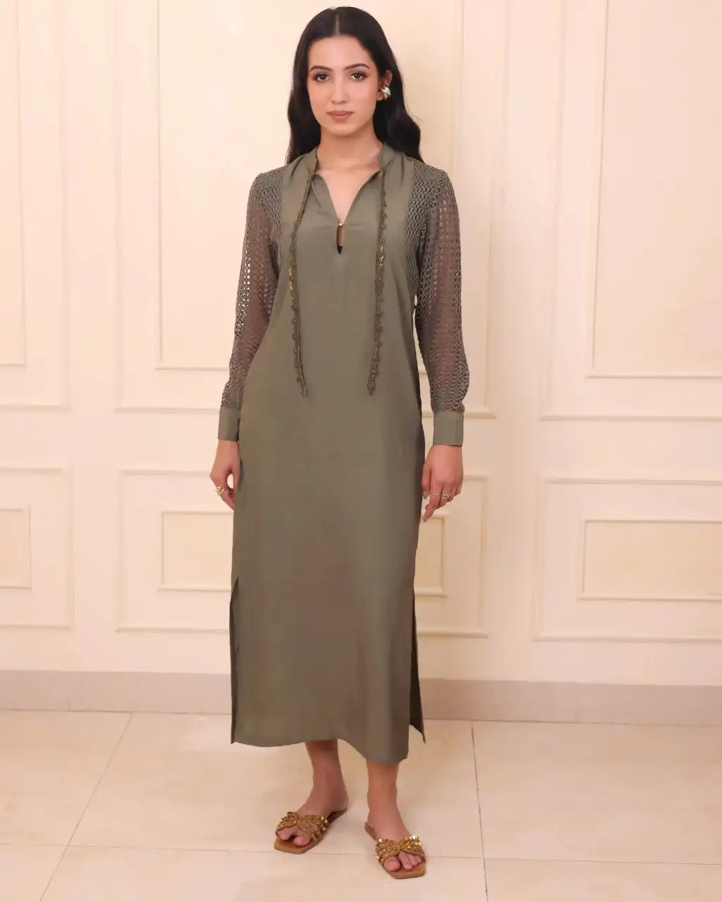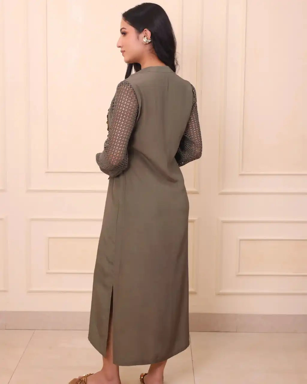 This stunning olive green dress is crafted from comfortable semi-crepe material, featuring designer sleeves that add a touch of elegance. The neckline boasts stylish tassels that hang gracefully, enhancing its charm. Perfect for making a statement at casual or semi-formal events, this dress exudes sophistication and style with its unique detailing and earthy tone.