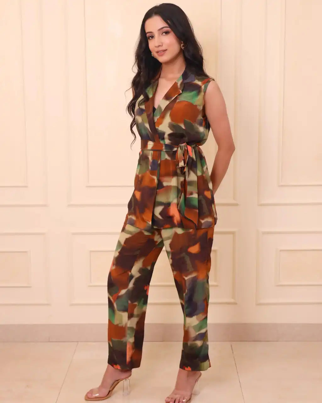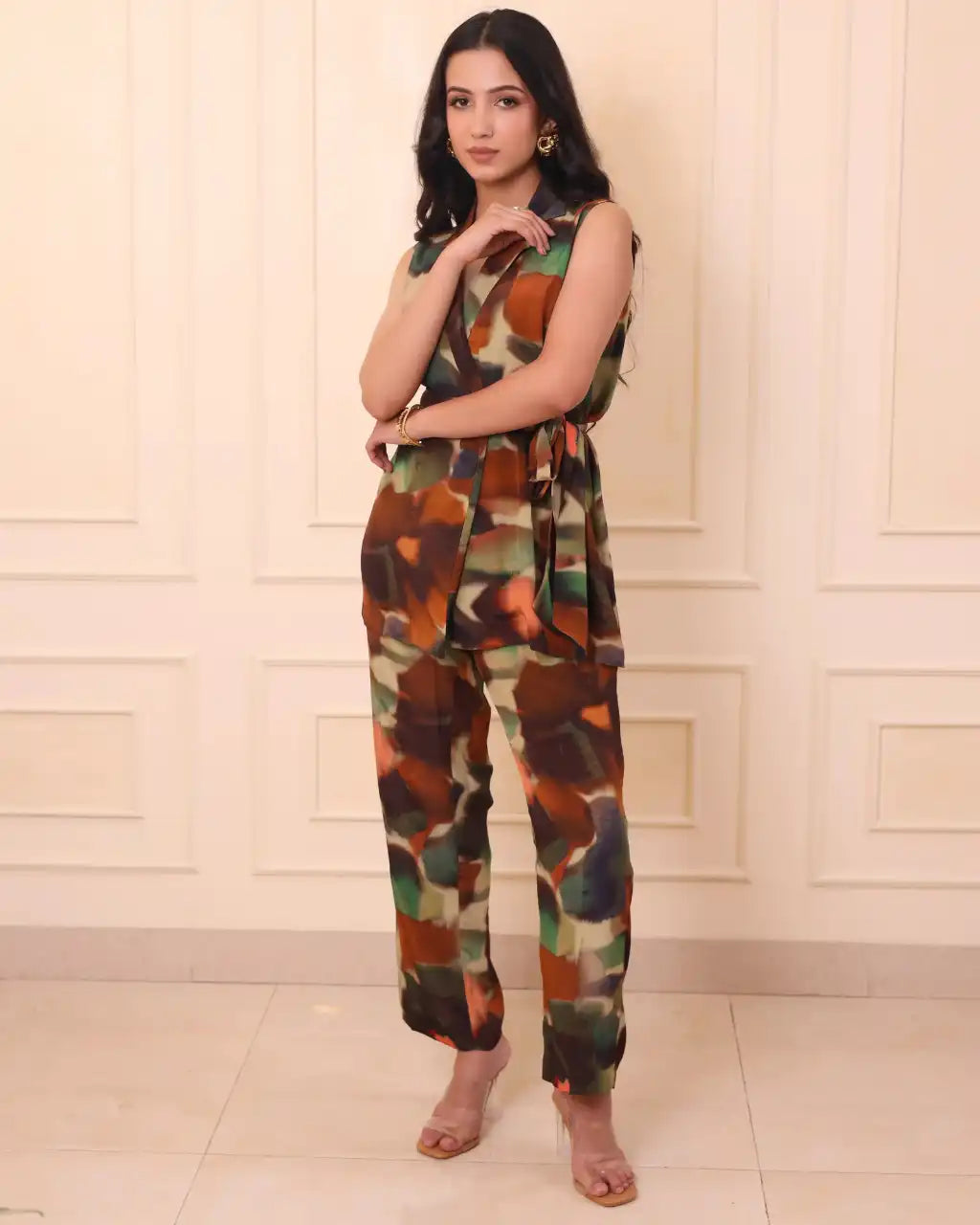 This stylish sleeveless cord set features an overlap jacket-style look, crafted from comfortable crepe material. Paired with a matching belt, it adds a touch of sophistication and definition to the outfit. Perfect for making a statement at casual or semi-formal events, this ensemble exudes modern chic with its sleek design and versatile style.