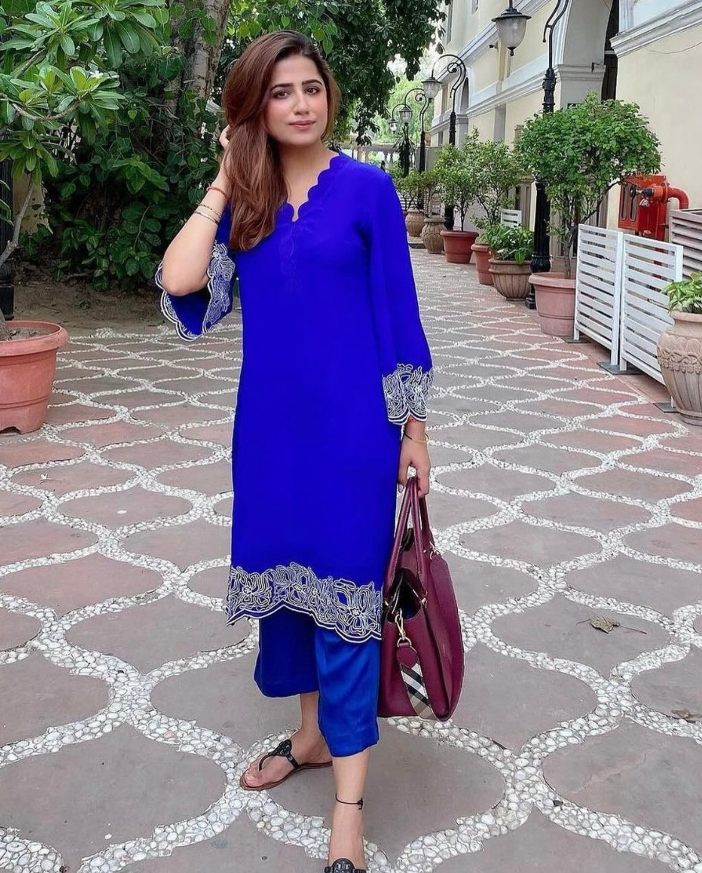 Pure crepe l kurta set featuring fine resham thread machine embroidery on the ghera and sleeves. Paired with matching pure silk pants for a rich, cohesive look—ideal for understated festive charm or elegant daywear