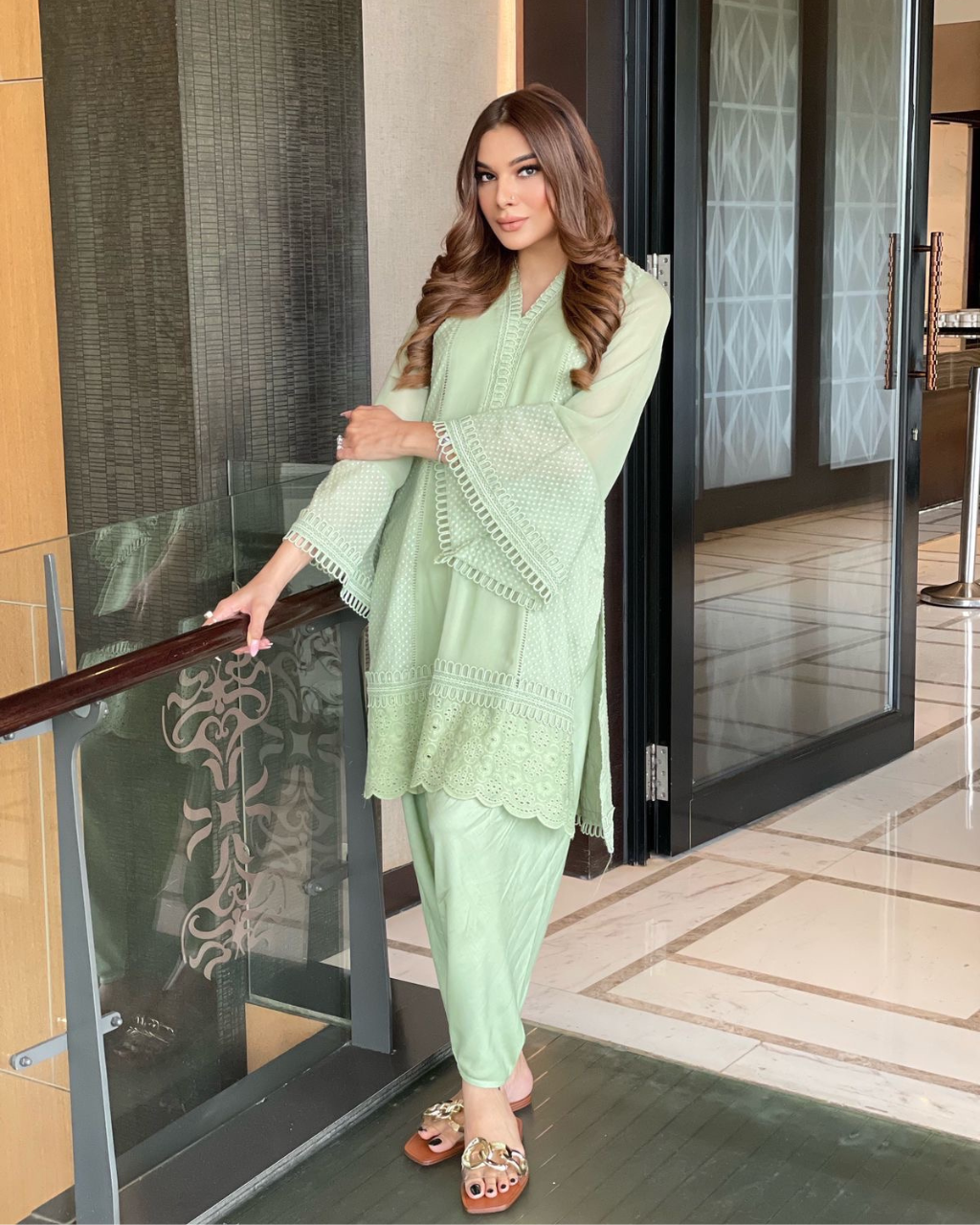 A unique fusion set featuring a short V-neck kurta with bell sleeves, crafted from a blend of georgette, silk, and cotton laces. Paired with a Pakistani-style narrow salwar (no moda), this look combines soft textures with graceful detailing for a modern yet traditional appeal.