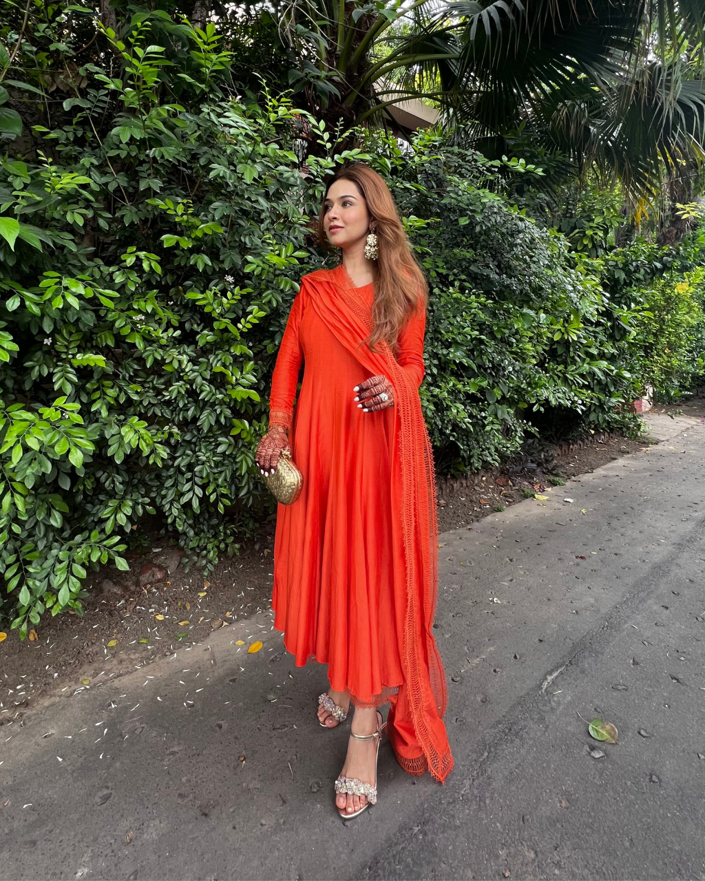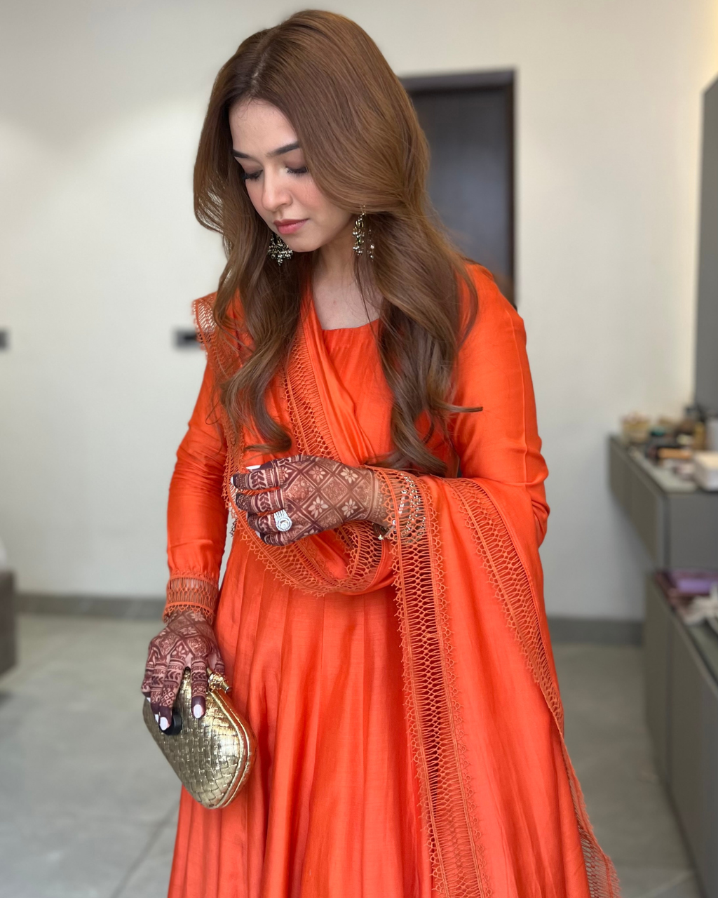 Elegant Anarkali set in soft modal muslin, featuring resham lace detailing, and lining in the kurta. Comes with matching palazzo and dupatta—perfect for festive or evening wear.