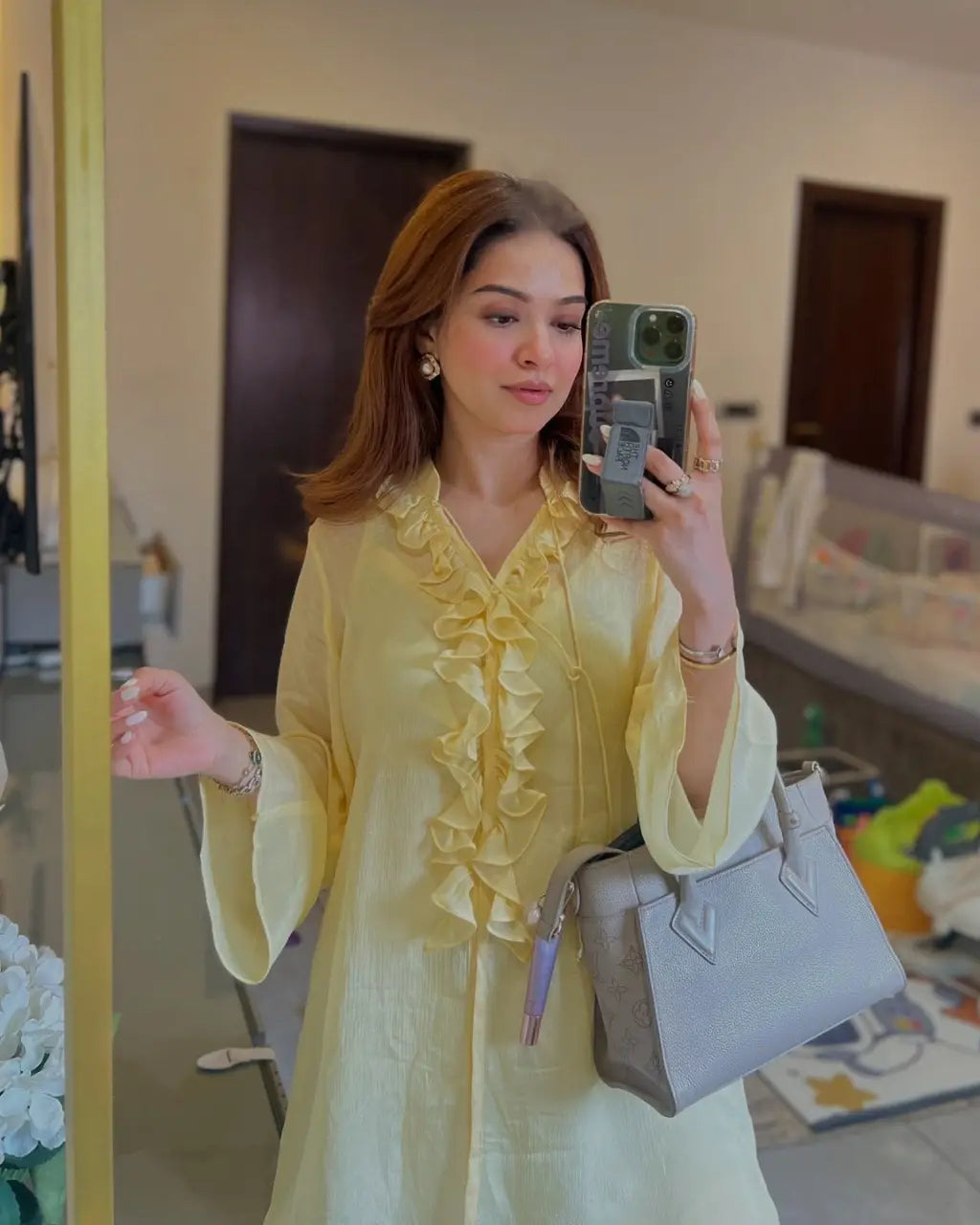 This vibrant yellow top is crafted from lightweight chinon chiffon, featuring delicate ruffles on the neckline for a feminine touch. Paired with a comfortable cotton slip for added coverage and ease, it's perfect for warm days and effortless style.