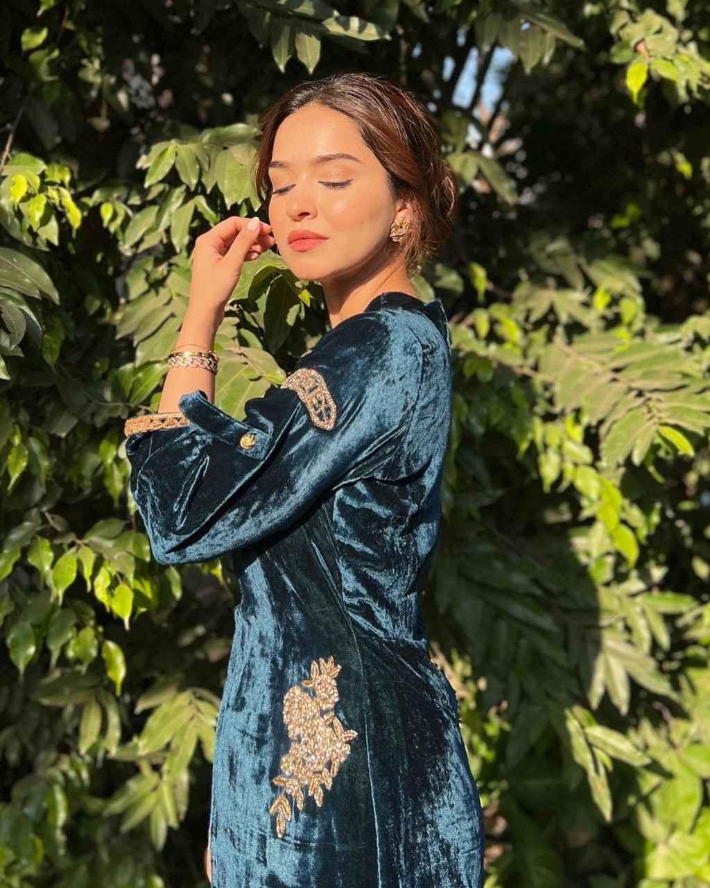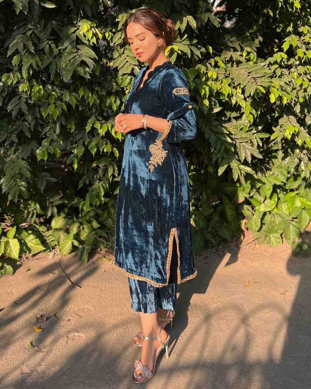 Teal velvet two-piece set featuring intricate dabka embroidery on the pockets. Crafted for effortless elegance, this rich velvet ensemble offers both comfort and regal charm—perfect for evening gatherings or winter festivities.